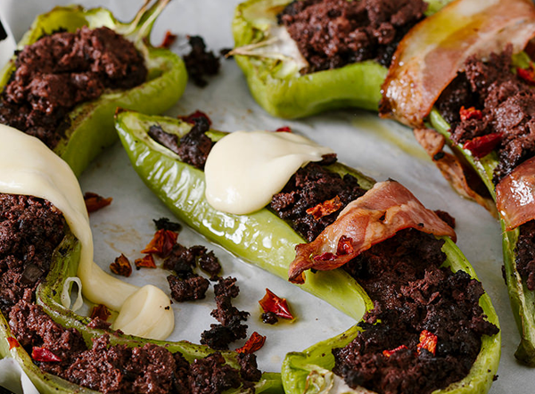 Rellenar los ajíes con Bepouch carne mechada y luego cubrir con queso de cabra.